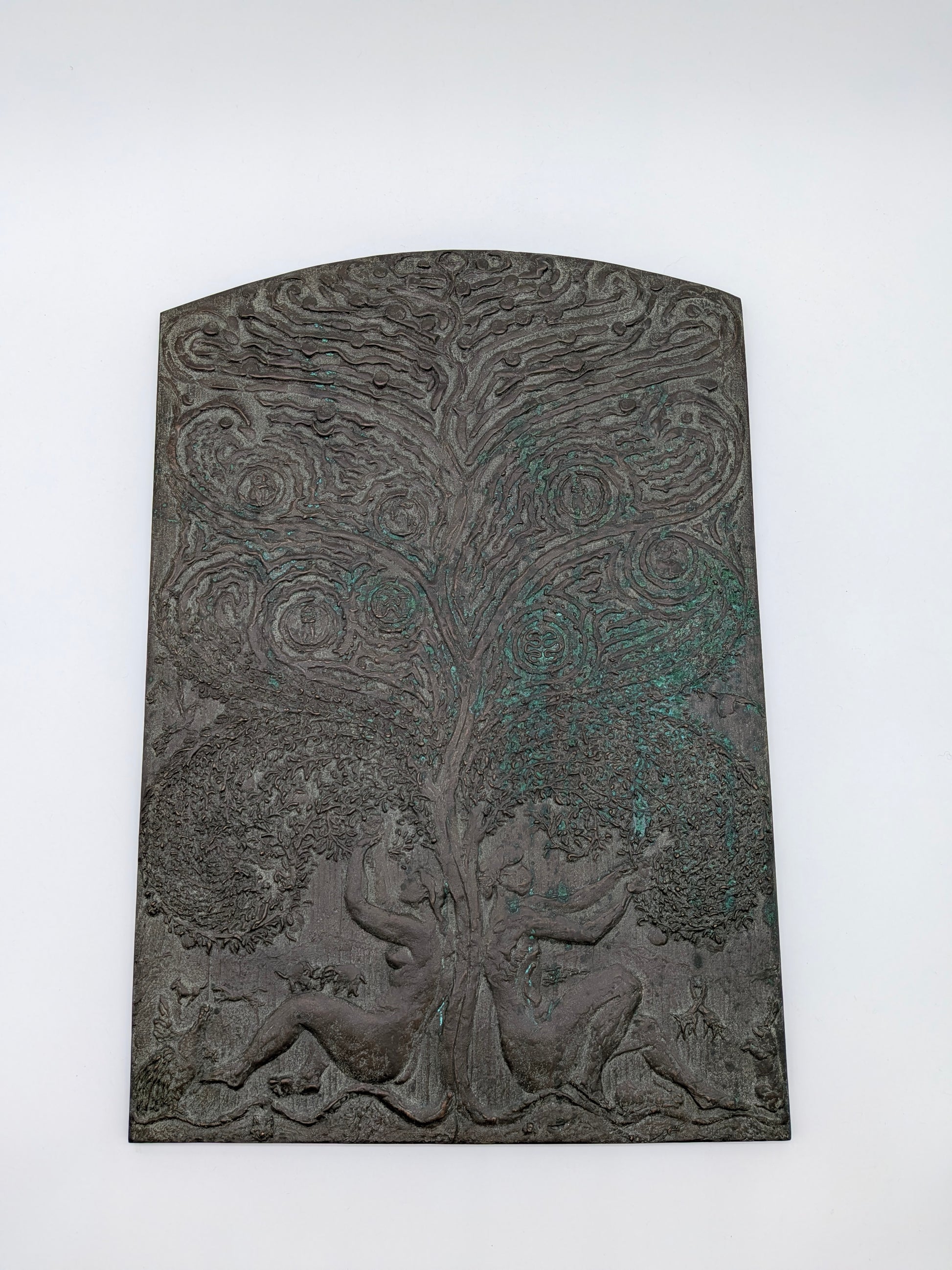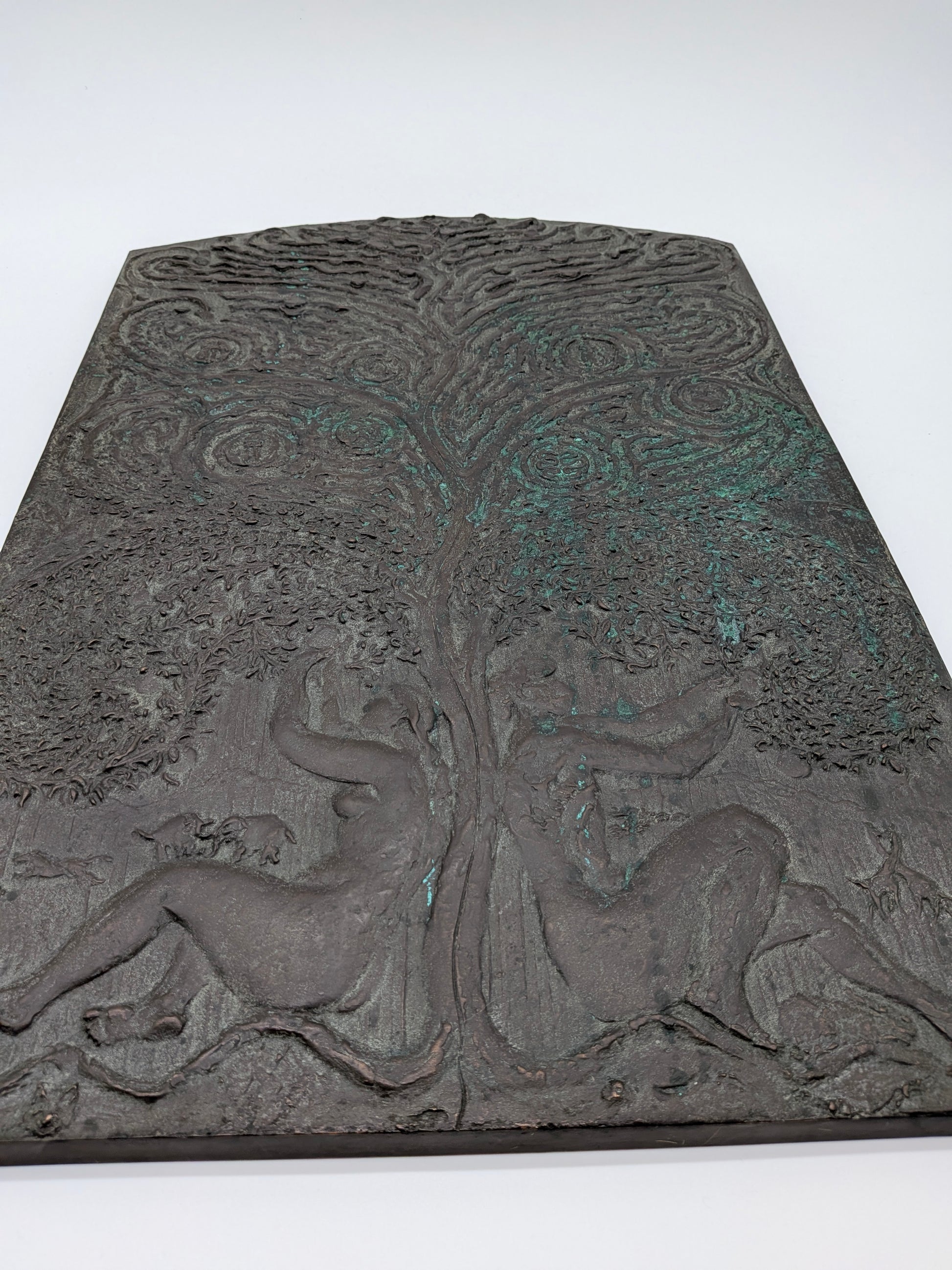 Centraal in het werk staat de Levensboom, waarvan de takken uitwaaieren in complexe, wervelende patronen die de gehele bovenkant van de plaat vullen. Aan de voet van de boom rusten Adam en Eva, organisch verbonden met de wortels en de aarde. De rijke patinering en de gedetailleerde textuur geven het werk een tijdloze, monumentale uitstraling.